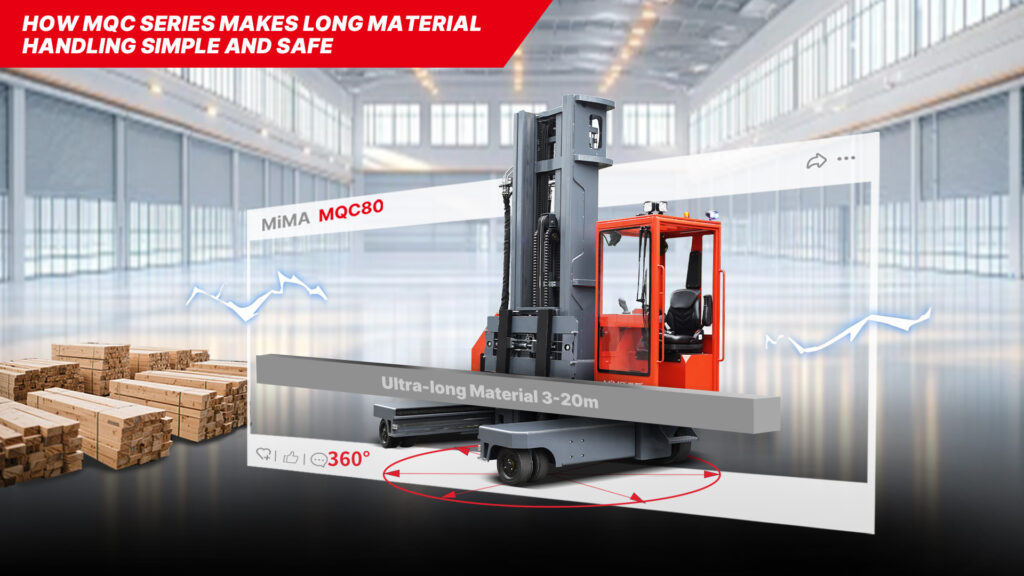 Manipolazione di carichi lunghi? Nessun problema. Un importatore di legname esce dalla cabina multidirezionale dell'MQC30 dopo un giro di prova, con il pollice alzato: "È come se il legno scivolasse lateralmente". Cinque minuti dopo si scambia i biglietti da visita con due ingegneri commerciali MiMA e prenota un sopralluogo per la prossima settimana.
